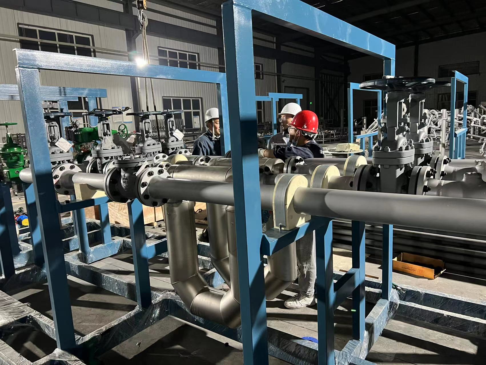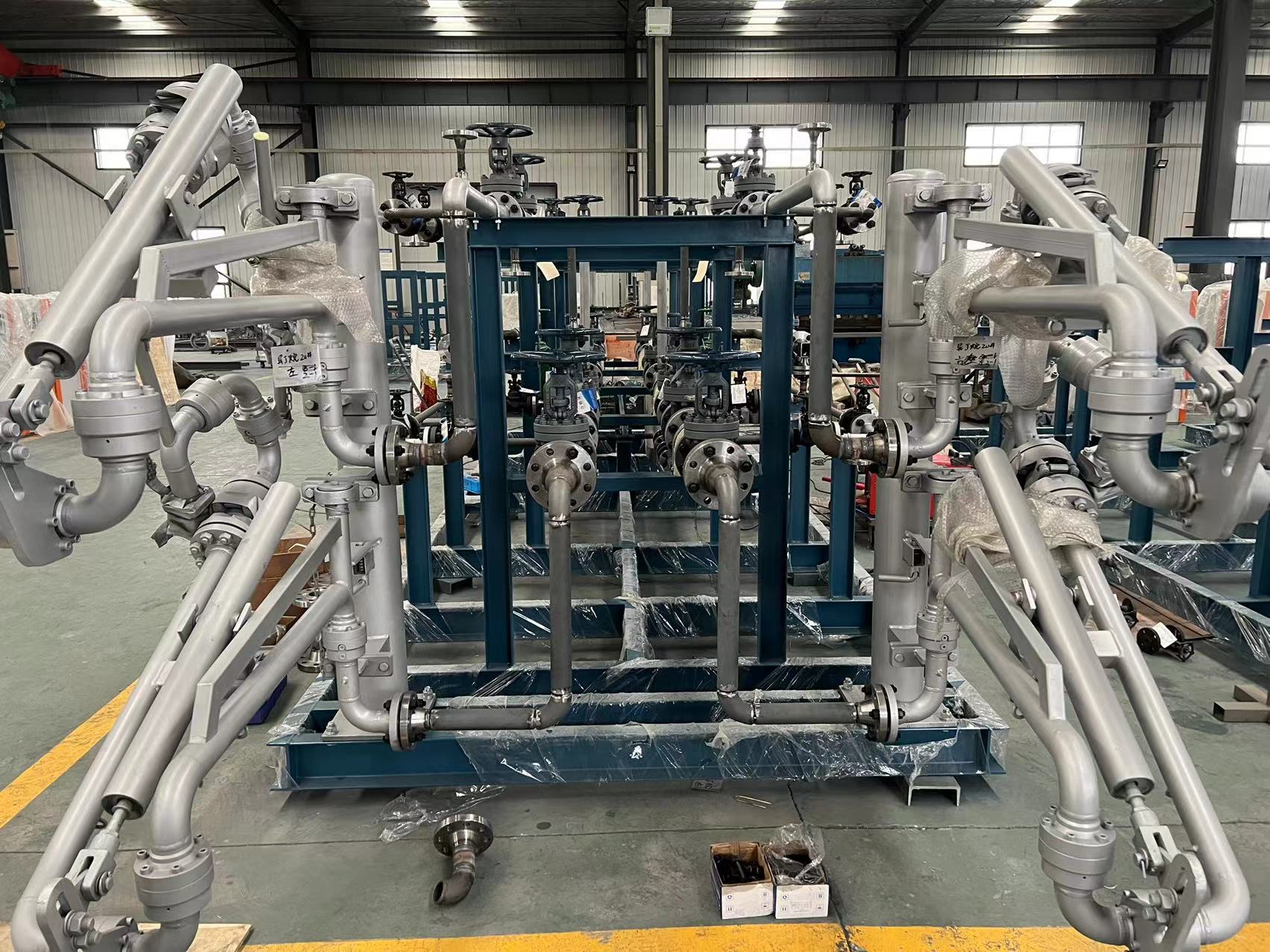 液化烴類介質(zhì)槽車裝車系統(tǒng)比油品槽車裝車系統(tǒng)復雜,現(xiàn)場組配裝車系統(tǒng),安裝和調(diào)試周期長,質(zhì)量不穩(wěn)定。為克服以上缺點,在工廠內(nèi),將裝車系統(tǒng)的儀表和設(shè)備集成在一個橇裝架上,并完成電氣安裝、強度試驗和低溫測試等,裝車橇到達用戶裝車現(xiàn)場后,接地角螺栓,連接工藝管線、通訊和供電線路就可以使用。結(jié)合液化烴類介質(zhì)裝車橇技術(shù)特點,對液化烴裝車系統(tǒng)中的設(shè)計數(shù)據(jù)、功能要求、操作方法進行敘述,綜合國內(nèi)裝車系統(tǒng)在使用中出現(xiàn)的問題提出了解決辦法。以下為公司近期液化烴類裝車撬的生產(chǎn)現(xiàn)場。